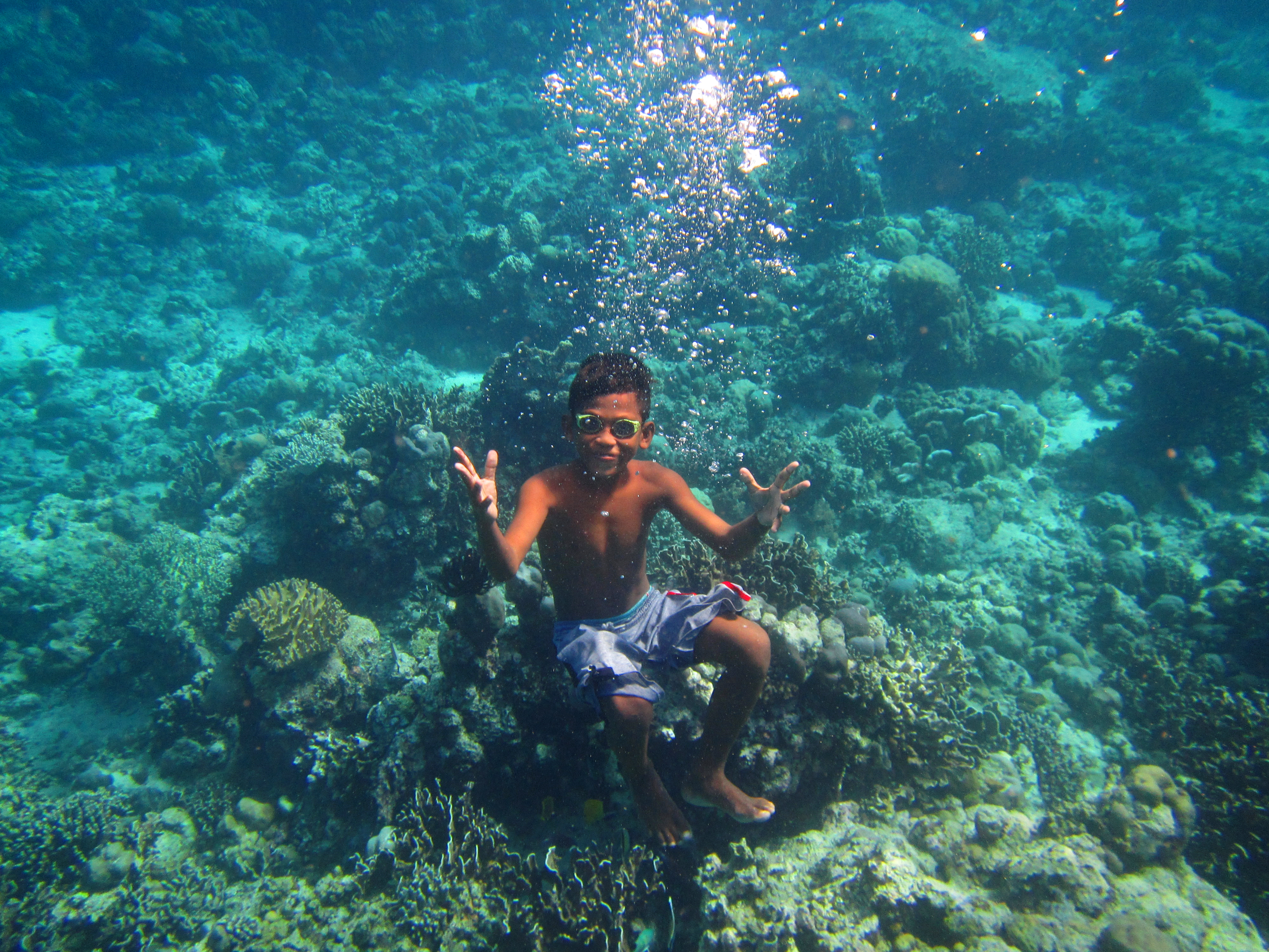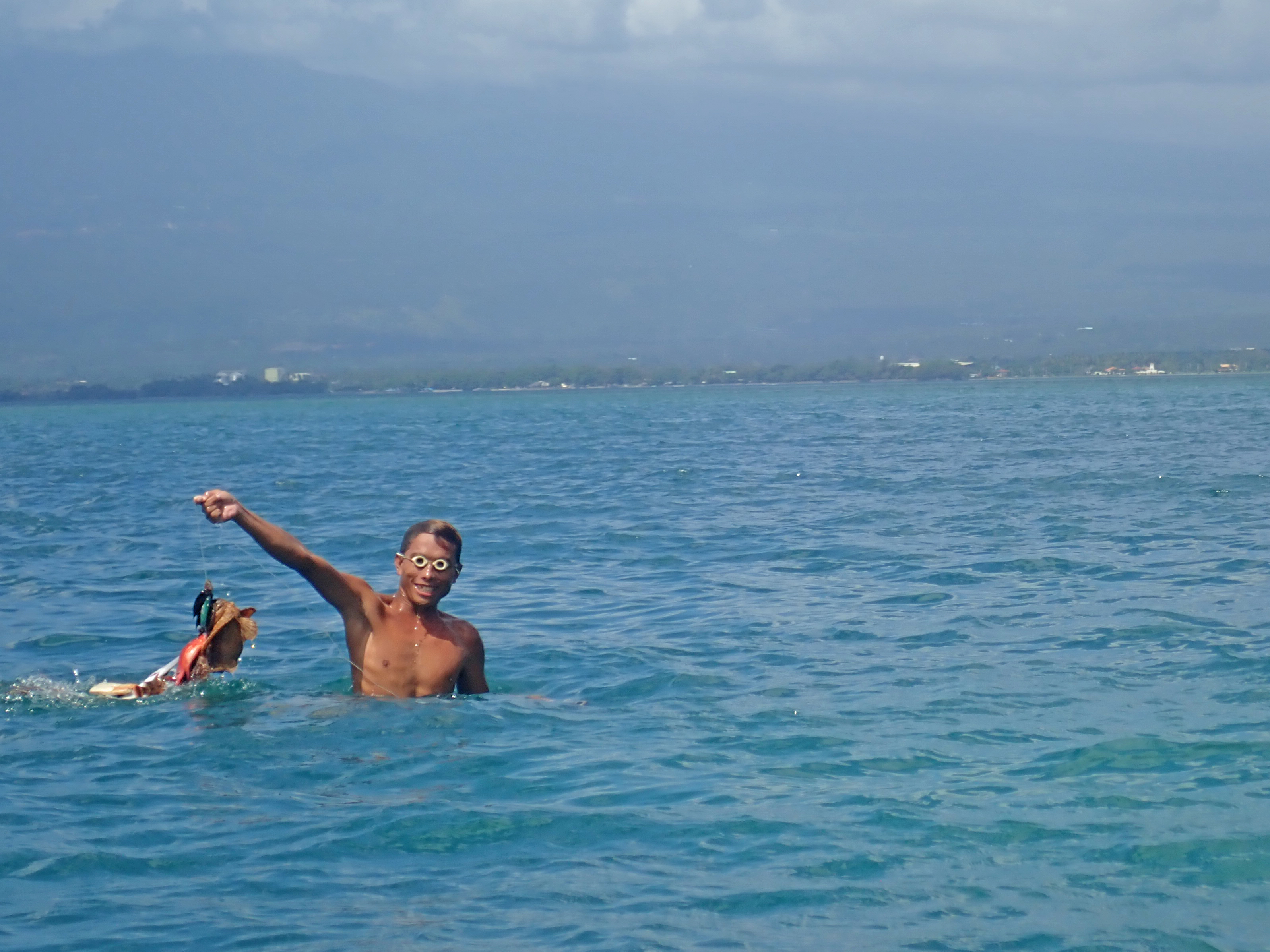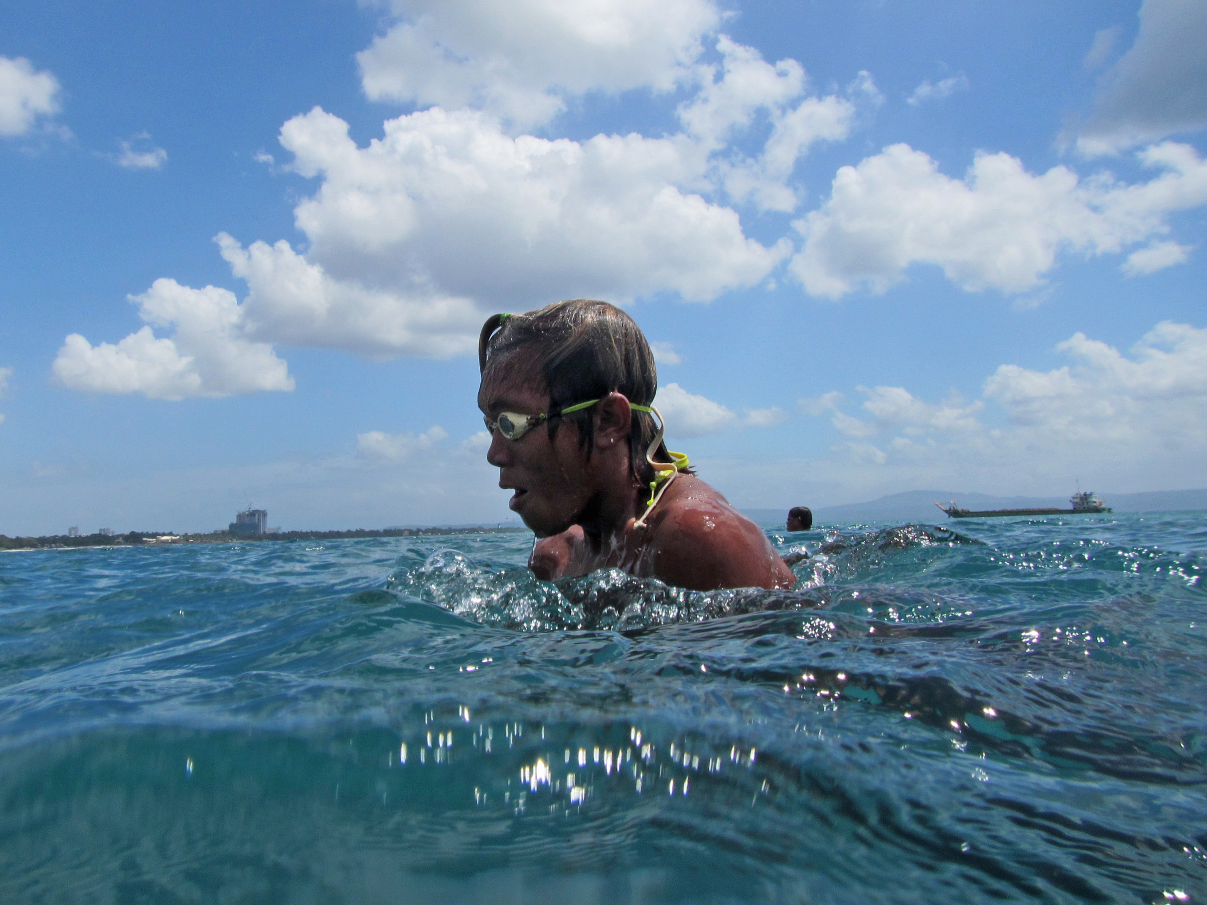 The second day in Semporna we headed to Mabul where we settled in a homestay owned by a Malaysian engineer from Kuala Lumpur. Near the homestay I could see approximately 15 anchored houseboats and many Bajau Laut men, women and children who were selling fish and coconuts to Chinese tourists near the island resorts. I jumped into the water and swam between the boats and resorts to interact with the vendors. First, the Bajau Laut first made little notice of me but when they realised that I could speak Sinama one elderly woman started to ask me for money. When I told her that I could hardly have any money in the water, she asked me for my goggles. One older Bajau Laut man got very happy and declared that I was also Bajau Laut, we were “da bangsa”, one people.