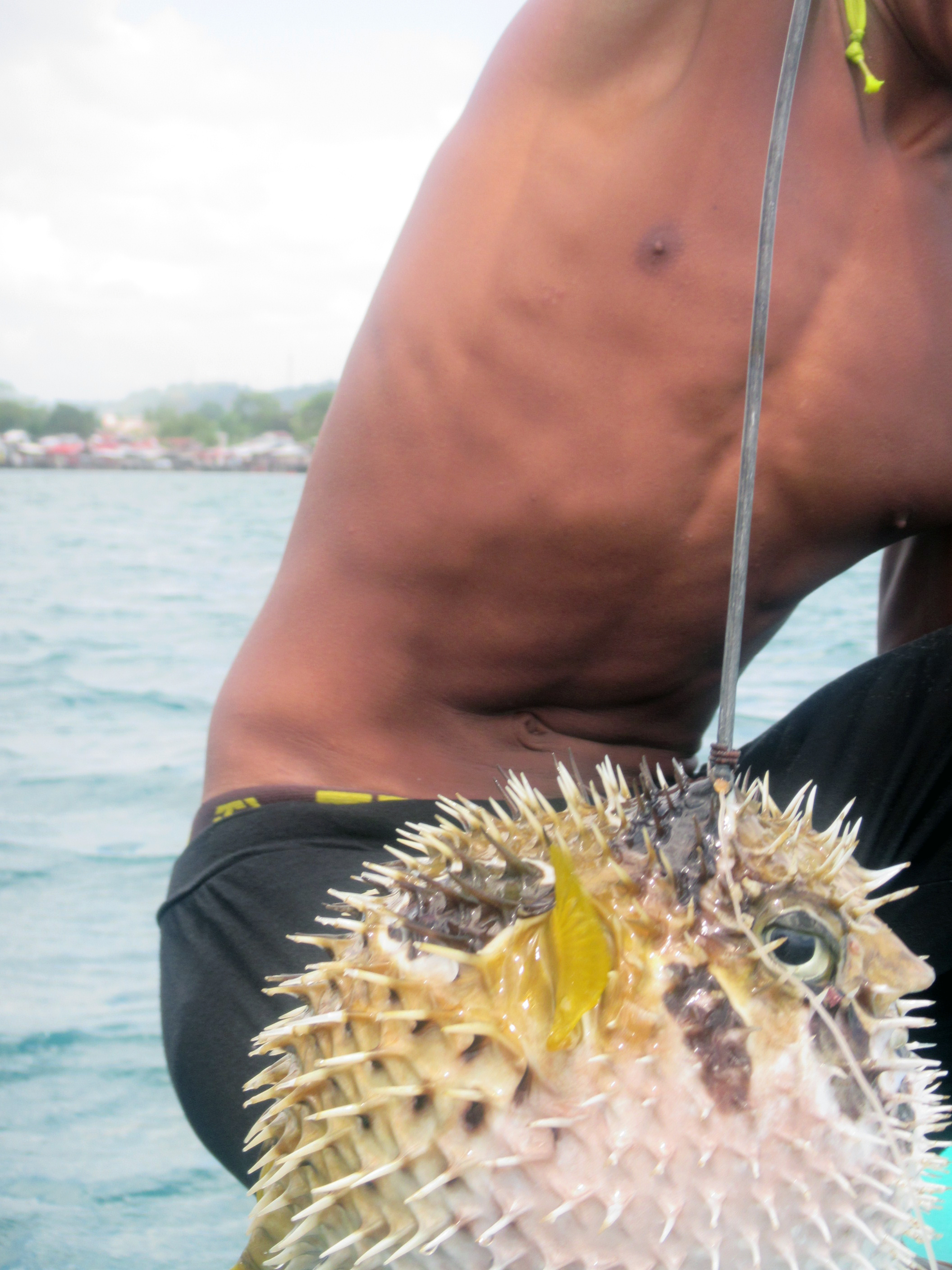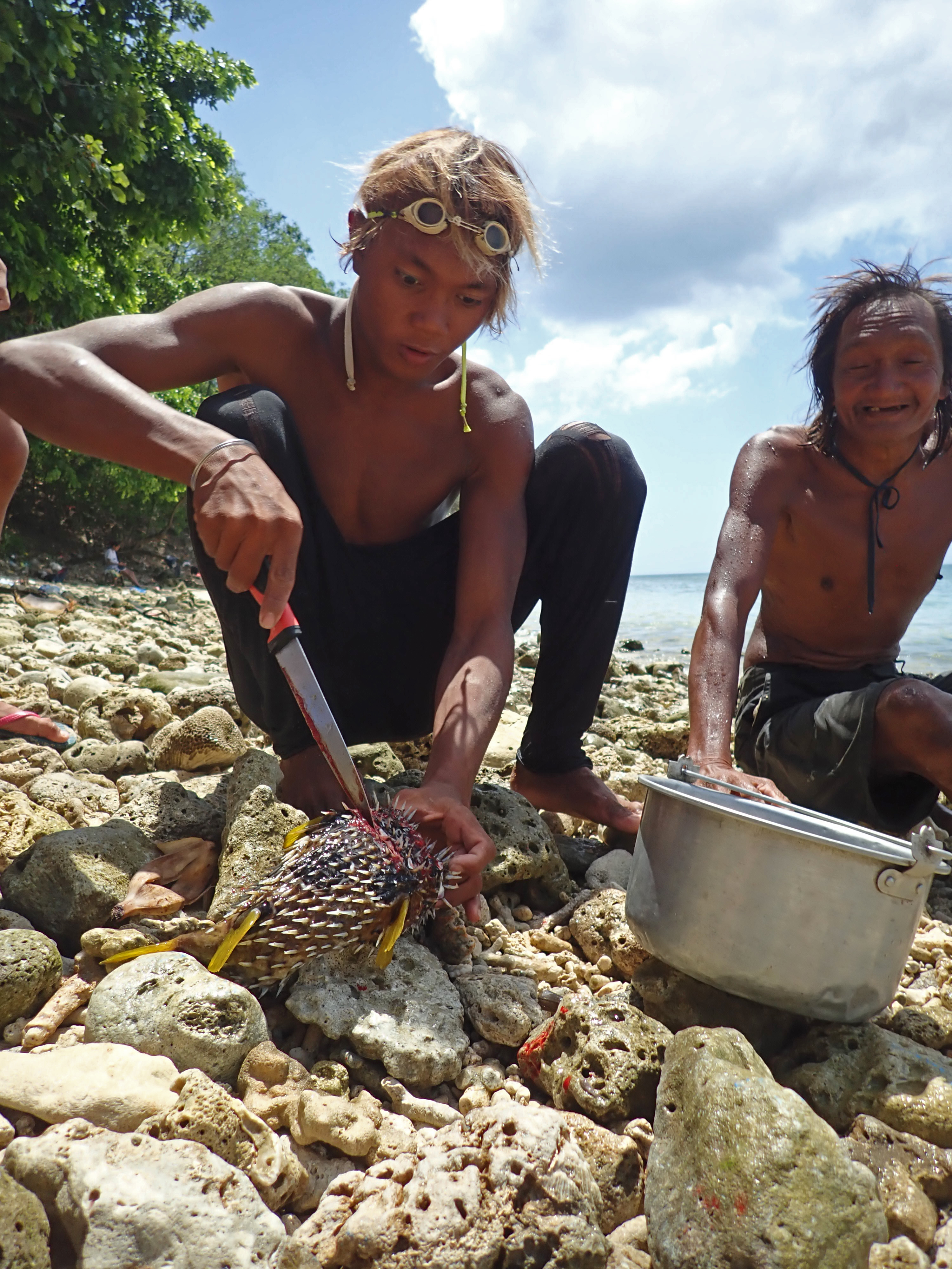 In Bodgaya we met up with the couples’ eight children and their in-laws. We also went net fishing nearby Bodgaya with five men on two wooden boats. Two men remained in the boats hitting the water with big sticks while the three others jumped into the water. They surrounded the fish and drove them towards the net. One man also used a speargun for catching larger fish. After some time, the fishermen pulled the nets into the boats. However, the catch was sparse and far from as opulent as some I have witnessed in Sampela where the same method is used. However, the fishing trip was just a showcase and they normally travel far from the community for fishing.